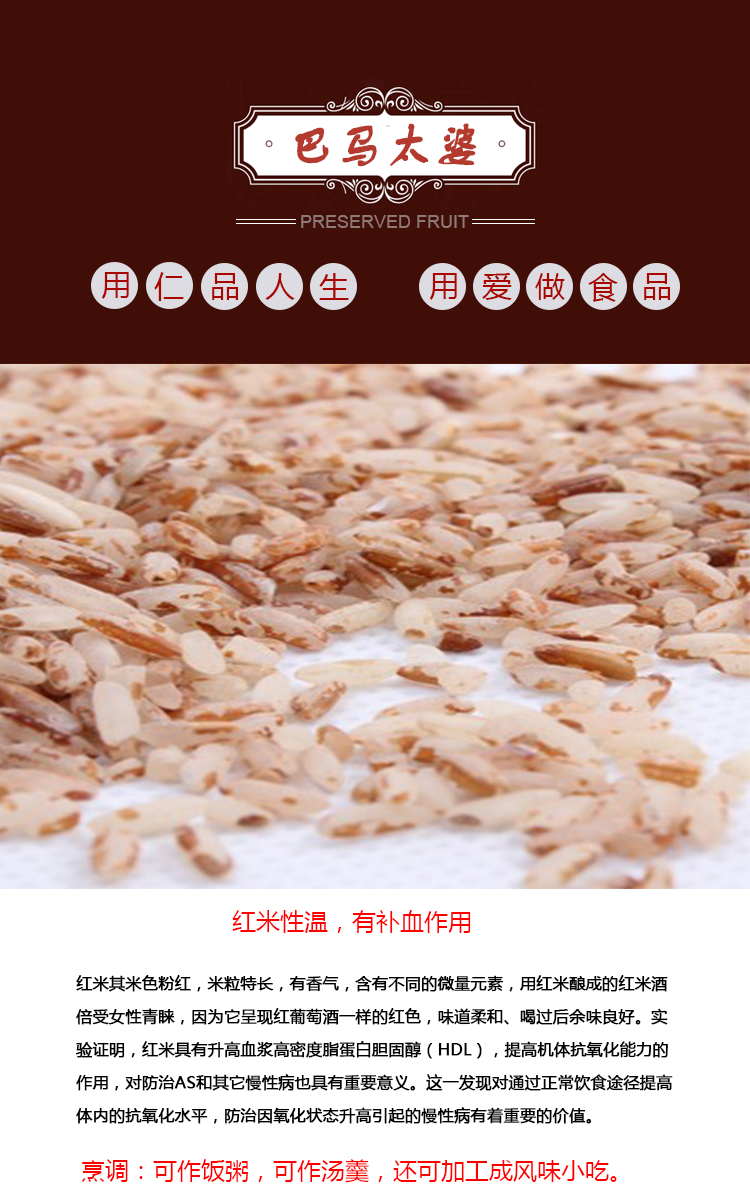 红米是红糙米再脱一层糙皮,含有丰富的淀粉与植物蛋白质,可补充消耗的体力及维持身体正常体温它富含众多的营养素,其中以铁质最为丰富,故有补血及预防贫血的功效