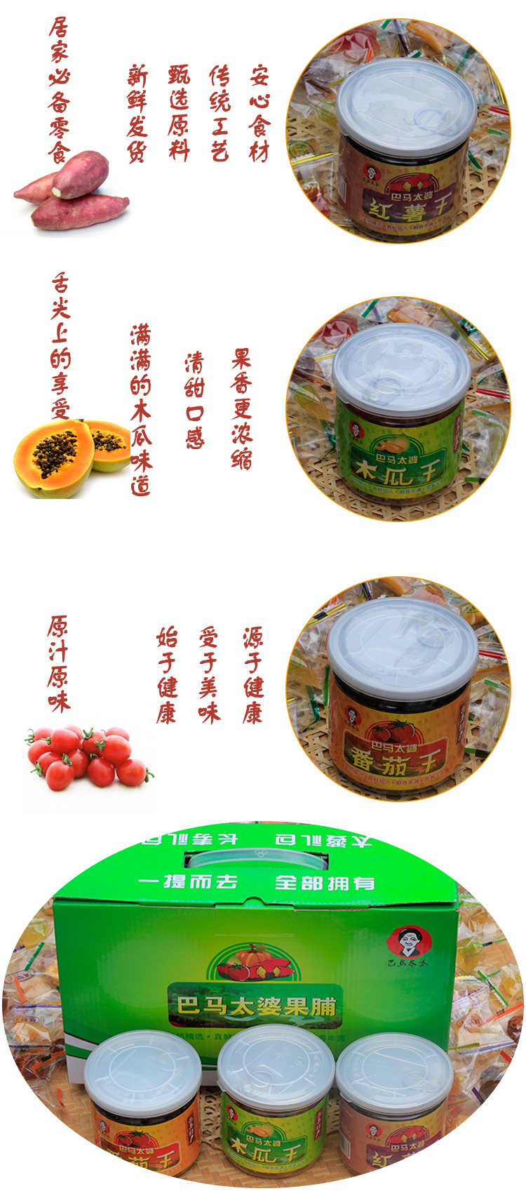 规格:180G*6罐/盒(木瓜干、红薯干、番茄干各2罐)